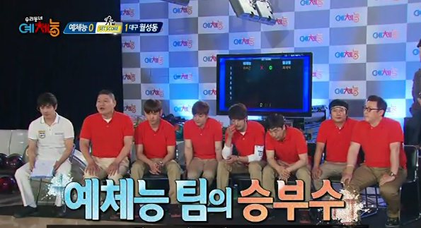 After another big loss, they called out Hyeongjun who had been hitting strikes all through out their practice, but another sad ending for YeCheNeung team. =( It's a 4 out of 7 gamewin, Dalhwan is their last chance. He first came on the show to play table tennis, but his team is now depending on him to win in bowling.